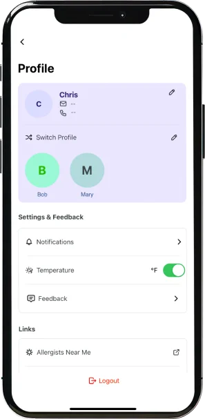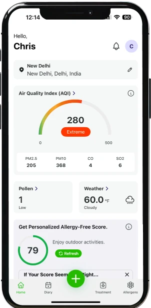 Si actualiza periódicamente sus síntomas y permite que la aplicación acceda a su ubicación, recibirá una puntuación de control de alergias que reflejará lo bien que está controlando su salud. Esta puntuación personalizada le permite tomar el control, tomar decisiones proactivas y protegerse a sí mismo y a sus seres queridos de los factores ambientales desencadenantes.