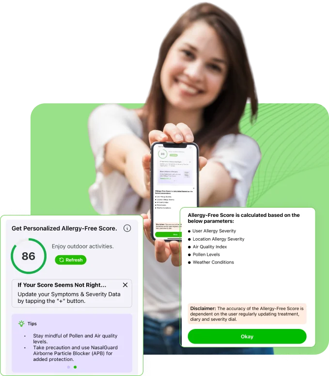 La Puntuación de Control de Alergias (Allergy-free Score) es una función personalizada y exclusiva de AllerAid. Esta puntuación se calcula utilizando factores clave, incluidos los síntomas diarios y las condiciones ambientales locales.